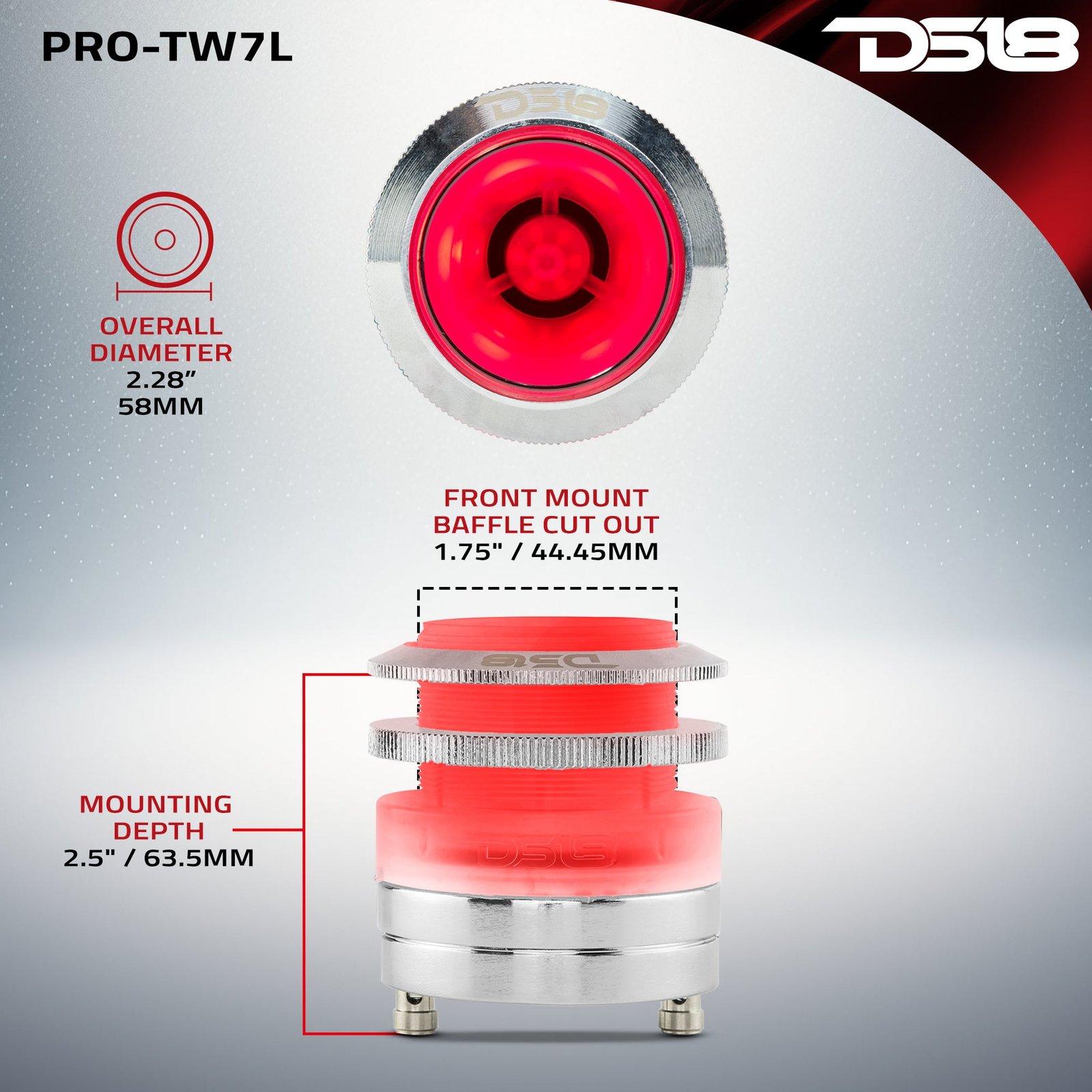 DS18 PRO-TW7L 2.3″ Neodymium Super Bullet Tweeter with RGB LED Lights 200 Watts 1″ Titanium 4-Ohm Vc Engineered and Designed in the US, the DS18 RGB PRO Tweeters are the top of the line in the Pro Audio/Voceteo market. These bad boys deliver so much power that you’d think with one tweeter your whole sound system is ready to deploy for a major concert, the new RGB lights will give you the show you are looking for. Simply put, there are no tweeters that can compare to the sophistication, beauty, and precision of these tweeters, especially in the Pro Audio/Voceteo World. Thanks to the demands of our customers, after months of relentless tests and experiments, our team of audio-experts perfected the PRO line. We are ecstatic to share with you the product of hard-work and “non-stop innovating attitude.” We are sure that you will love your new PRO Tweeters as much as we do. Warning: Extremely Loud. DS18 is a proud member of CEA, IASCA, MERA, and SEMA Highlights Highly popular small tweeter design that handles big power. Huge sound for such a small tweeter and the size makes it highly versatile. Easily repaired in just a few minutes anywhere in the low chance you need to swap the voice coil out for a new one. Adjustable mounting depth set screws so you can sir flushed or flared. RGB LED connections so you can get any color you want to match your vehicles theme. Technical Details Download PRO-TW7L Product Manual Model: PRO-TW7L Type: Bullet Tweeter RMS Power: 100W MAX Power: 200W Diaphragm Material: Aluminum Sensitivity: 102dB Impedance: 4 ohms Frequency Response: 4KHz – 20KHz Magnet: High Strength Neodymium Voice Coil: 1″ High-Temperature Kapton with capacitor crossover (included) Replacement Diaphragm: PRO-TW7VC Package Quantity: 1