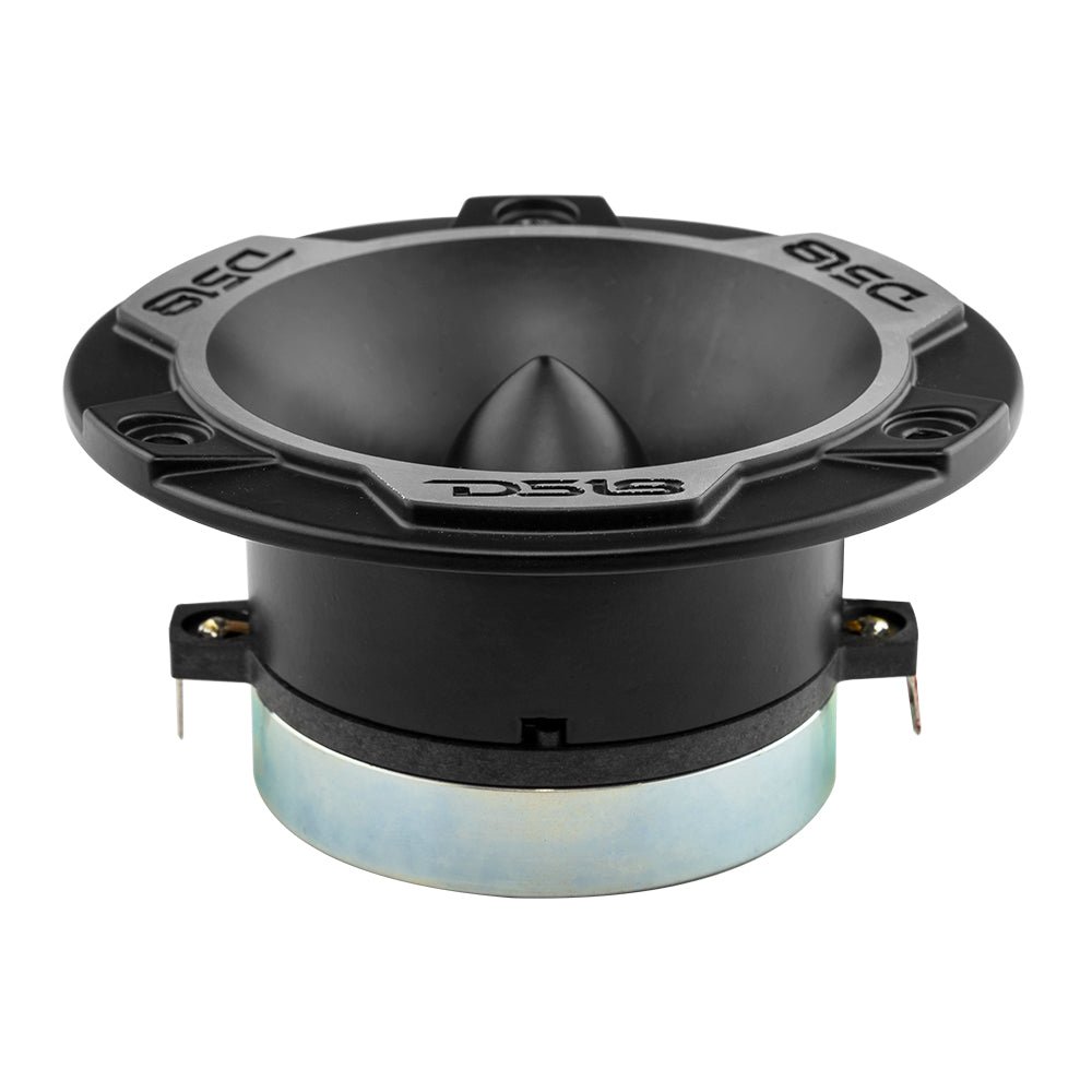 DS18 PRO-TWN6.4 4″ PRO High Compression Neodymium Tweeter 1.25″ Voice Coil 4 Ohm The PRO-TWN Series Tweeter, a staple in the competitive professional audio scene, is back with boosted brilliance and clarity. This 4” Neodymium Super Bullet Tweeter is equipped with a 1.25” Voice Coil and handles AES power at 75W, Program Power at 150W, and Peak Power at 300W. The neodymium magnet increases the efficiency of the tweeter and significantly lowers its weight. With an extremely high sensitivity of 109 dB, it doesn’t take too much for these tweeters to get extremely LOUD! With minimal amounts of power, these tweeters still deliver vibrant highs with endless altitude! This 4-ohm tweeter is guaranteed to enrich your high frequency response and would be a complement to every sound system! Highlights Full size pro audio super tweeter producing crazy loud high range notes for your system. Designed to fit in most spaces with slight modification or fabrication. Great For Car Audio Pro Audio Technical Details Download PRO-TWN6.4 Product Manual SPECIFICATIONS Nominal Diameter 4″ / 100mm Nominal Impedance 4 ohms AES Power Handling 75 Watts Program Power Handling 150 Watts Peak Power Handling 300 Watts Sensitivity (1w/1m) 109 dB Frequency Response 2K-20KHz Recommended Hi Pass Crossover 3KHz BODY/ FEATURES Pair or Single Single Body Material Aluminum Body Color / Finish Black / Machined Bullet Material Aluminum MOTOR Voice Coil Diameter 1.25″ / 32mm Voice Coil Former Material Kapton Winding Material CCAR Diaphragm Material Polyimide Magnet Material Neodymium Magnet Weight 1.05 oz MEASUREMENT Overall Diameter 3.93″ / 100mm Overall Depth 1.96″ / 50mm Front Mount Baffle Cutout 3.22″ / 82mm Mounting Depth 1.77″ / 45mm