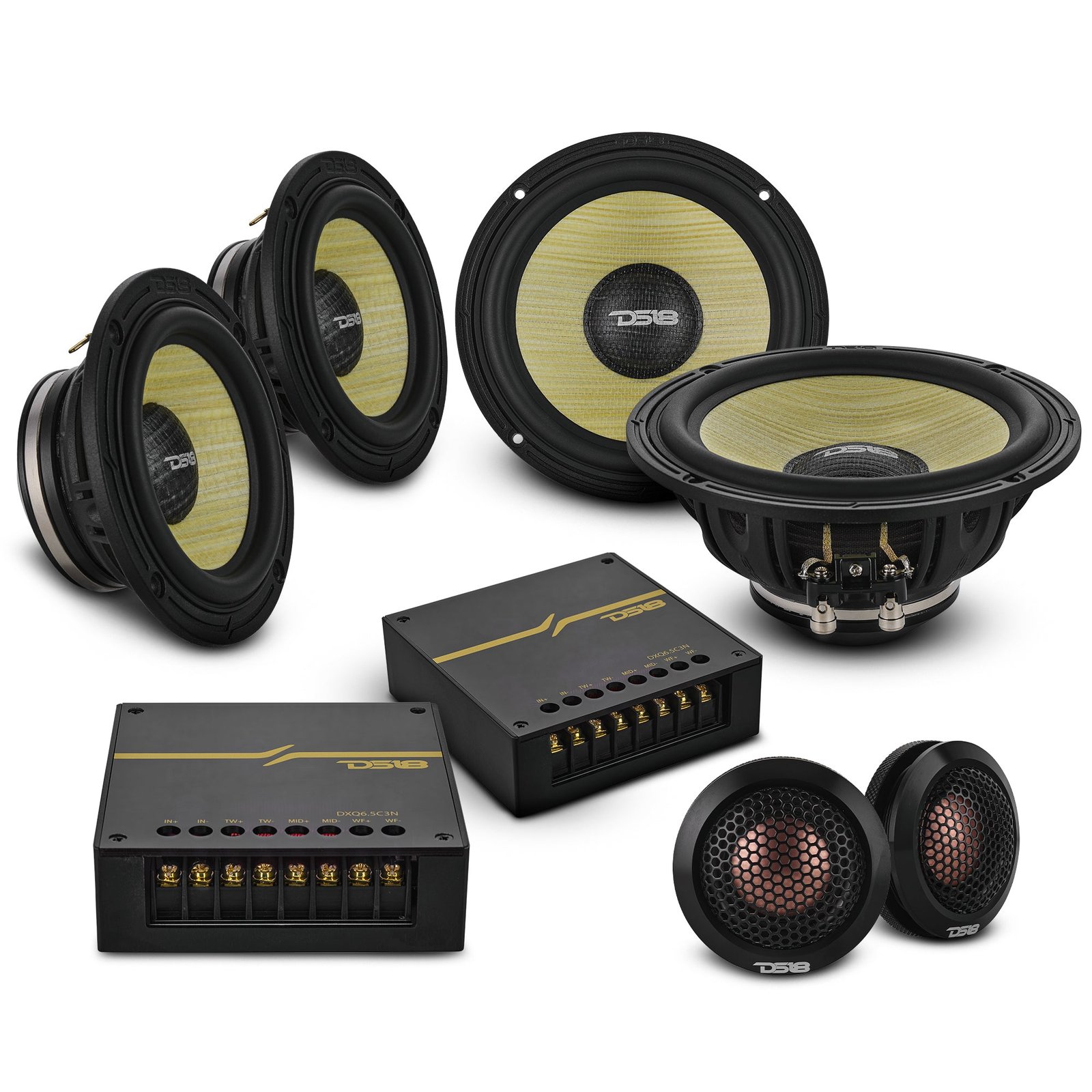 6.5″ 3-Way Component Speaker Set with Neodymium Magnet and Yellow Straw + Composite Foam Cone The DXQ6C3N is a complete audio solution for professional-grade sound. This 3-way system covers a wide frequency range from 35Hz to 20kHz for an immersive, detailed listening experience. Powerful 6.5” WooferThe foundation of this system is the 6.5-inch woofer, crafted with a yellow straw and composite foam cone designed for a lightweight yet rigid diaphragm. This combination provides tight, accurate bass and mid-bass response while minimizing distortion and maximizing durability. Clear and Natural MidrangeThe 3.5-inch neodymium midrange driver bridges the gap perfectly. Its composite cone delivers smooth, natural sound that reproduces vocals and instruments with incredible clarity. Bright and Detailed TweeterCompleting the set is the 2.2-inch silk dome tweeter with a powerful neodymium magnet. Its lightweight design allows for fast transient response and crisp detail that cuts through road noise. The tweeter’s silk diaphragm produces smooth highs without harshness. Precision Crossover NetworkA carefully designed 3-way passive crossover separates the frequencies between the woofer, midrange, and tweeter. With points at 800Hz and 3.8kHz, the crossover ensures each driver performs optimally across the entire spectrum. Easy InstallationWith a mounting depth of just 3.4″ for the woofer, and compact sizes for the midrange and tweeter, the DXQ6C3N fits most factory locations and custom setups effortlessly. Complete Your SoundstageDS18’s DXQ6C3N offers professional-grade sound quality that transforms every ride.