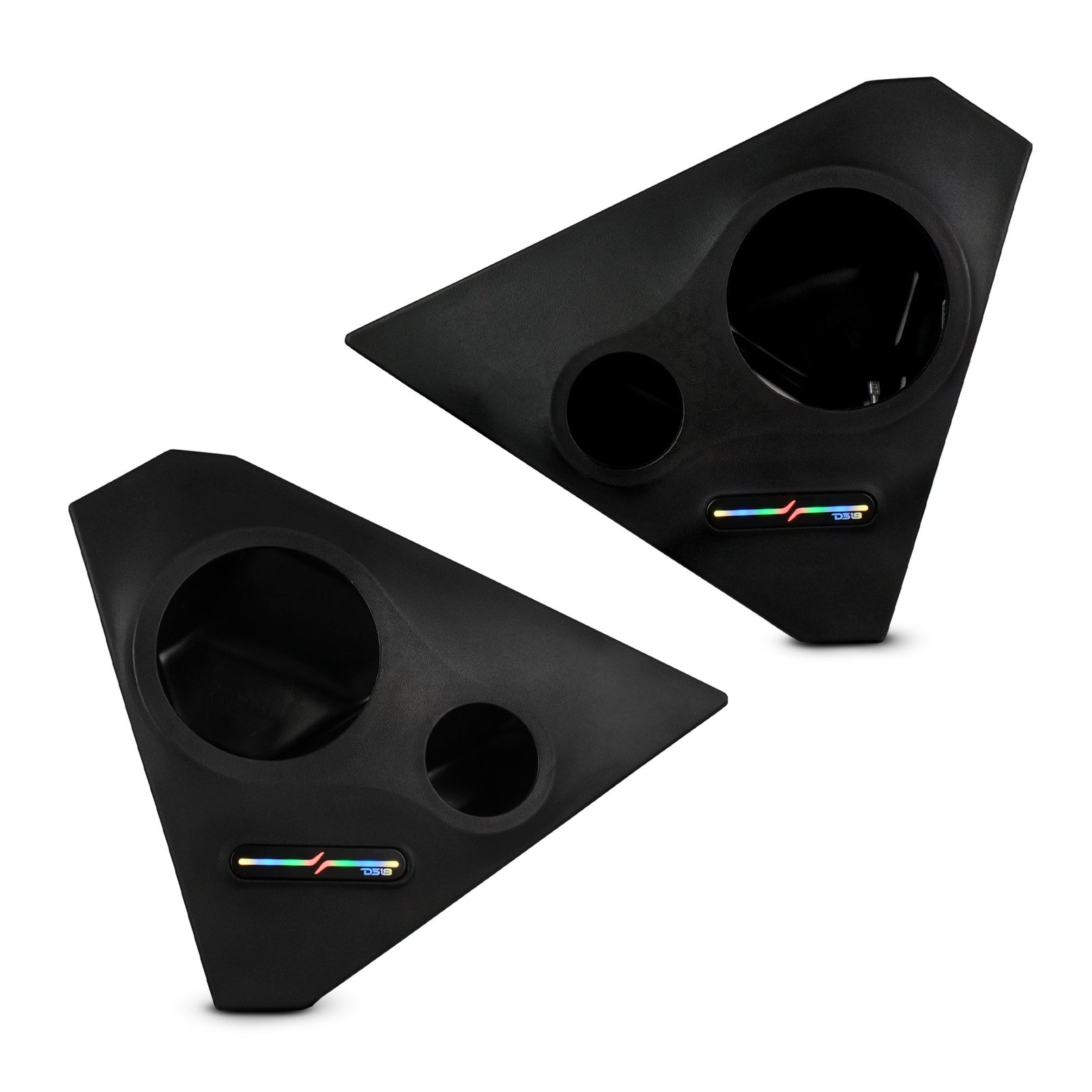 Boost your Slingshot’s performance and clarity with the SLG-FKP6V2 Front Kick Panel Pods, designed to fit one 6.5″ speaker and one 3.8″ bullet tweeter into your Polaris Slingshot seamlessly. These pods come as a set, complete with driver and passenger side enclosures that perfectly match the factory look of your Polaris Slingshot. The easy installation process uses your Slingshot’s factory bolts for a perfect fit so you spend less time installing and more time getting LOUD! Equipped with new exclusive digital LED lighting (LC-DRM and LC-BTC Recommended), these pods don’t just sound good—they look amazing too. The durable PE waterproof enclosure with UV protection ensures longevity and resilience against the elements, making it perfect for all weather conditions. Coated metal brackets add an extra layer of durability, providing better resistance to the elements. Designed to house most 6.5″ DS18 speakers (PRO-SM6.2 Recommended) and 3.8″ bullet tweeters (PRO-TW4L Recommended), these front kick panel pods significantly enhance your sound system performance. The sealed type waterproof enclosure and damping material ensure optimal speaker performance, delivering crisp highs and deep bass tones. All necessary hardware and OFC tinned wiring for power handling and durability are included, making the installation hassle-free. These front kick panel pods fit Polaris Slingshot models from 2015 to the current year, making them the ideal choice for any Slingshot enthusiast looking to elevate their ride’s audio experience. Upgrade your Slingshot’s audio with the experts — choose DS18’s SLG-FKP6V2 Front Kick Panel Pods today! SPEAKERS NOT INCLUDED